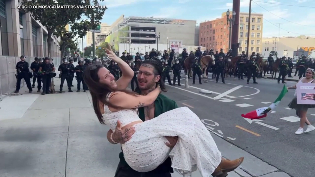 The video, taken by CalMatters reporter Sergio Olmos, shows a woman showing off her ring as she’s picked up by her fiancé. Armed police – some on horseback – are seen lined up a couple of feet behind the couple.