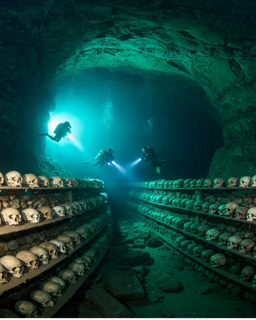 In a stunning archaeological breakthrough, divers exploring the depths of a submerged cavern have uncovered an eerie sight—an endless array of human skulls, meticulously preserved in an underwater crypt. The magnitude of this chilling discovery has sparked a whirlwind of speculation: Is this the long-lost burial site of an ancient civilization? A mass sacrificial chamber from a forgotten era? Or, perhaps, evidence of a dark secret humanity was never meant to uncover?