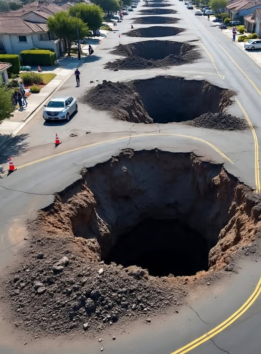 In a stunning and alarming development early this morning, a series of massive sinkholes suddenly appeared along a quiet suburban street in California, tearing through the asphalt and disrupting an entire residential neighborhood. The phenomenon unfolded around 6:30 a.m., leaving at least eight gaping craters, each estimated to be over 30 feet wide and up to 50 feet deep, stretching down the length of the street like a trail of destruction.