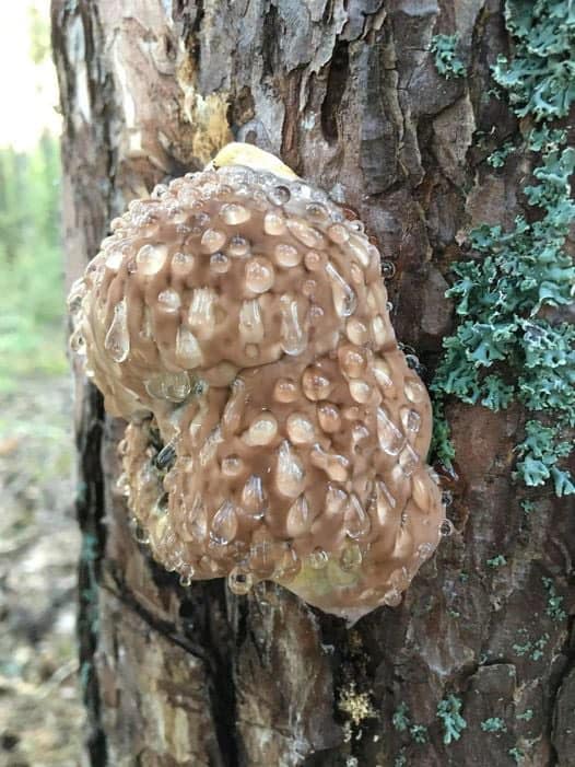 Certain fungi have a peculiar habit of exuding moisture beads, a phenomenon known as guttation. Some polypores, like Fomitopsis pinicola, create a liquid so similar to tears that you could mistake it for actual tears being released by the fungus. or even perspiring. Some animals create colored droplets that resemble blood, tar, or even milk.
