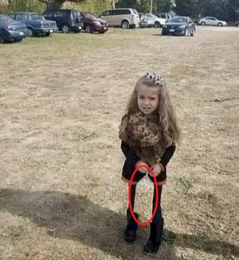 People were left baffled after looking at the image, which depicts an unfed child posing in a park with her hands in front of her waist.